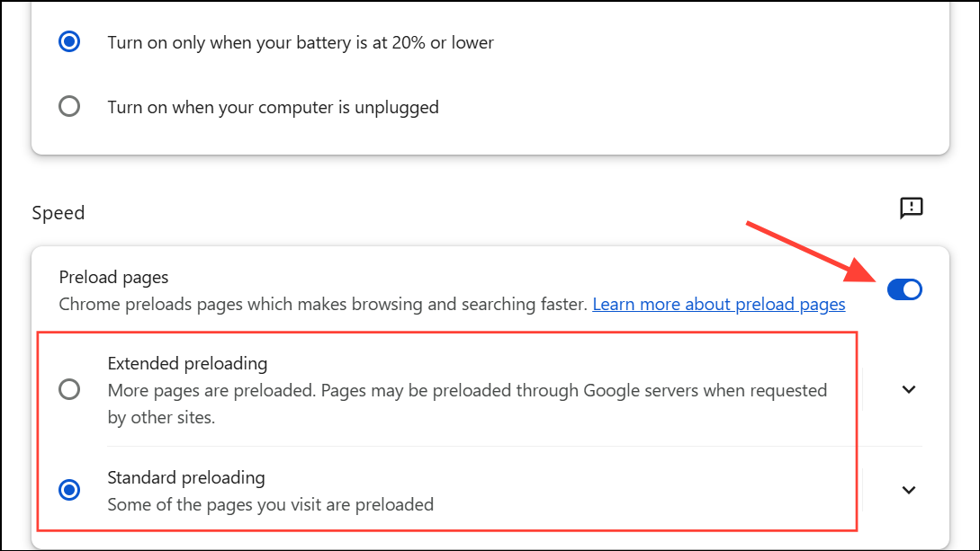 Step 2: Scroll down to the Preload section and click the toggle to turn it on if it isn't on already. You can then choose between Standard and Extended preloading.