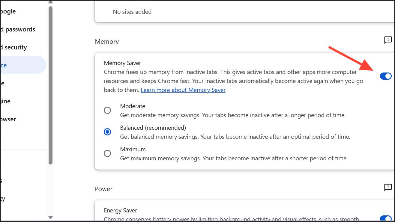 Chrome's Memory Saver mode automatically suspends inactive tabs to free up memory. To ensure it's enabled, open Settings, select Performance, and verify that Memory Saver is toggled on. You can also specify exceptions for tabs you don't want to suspend.