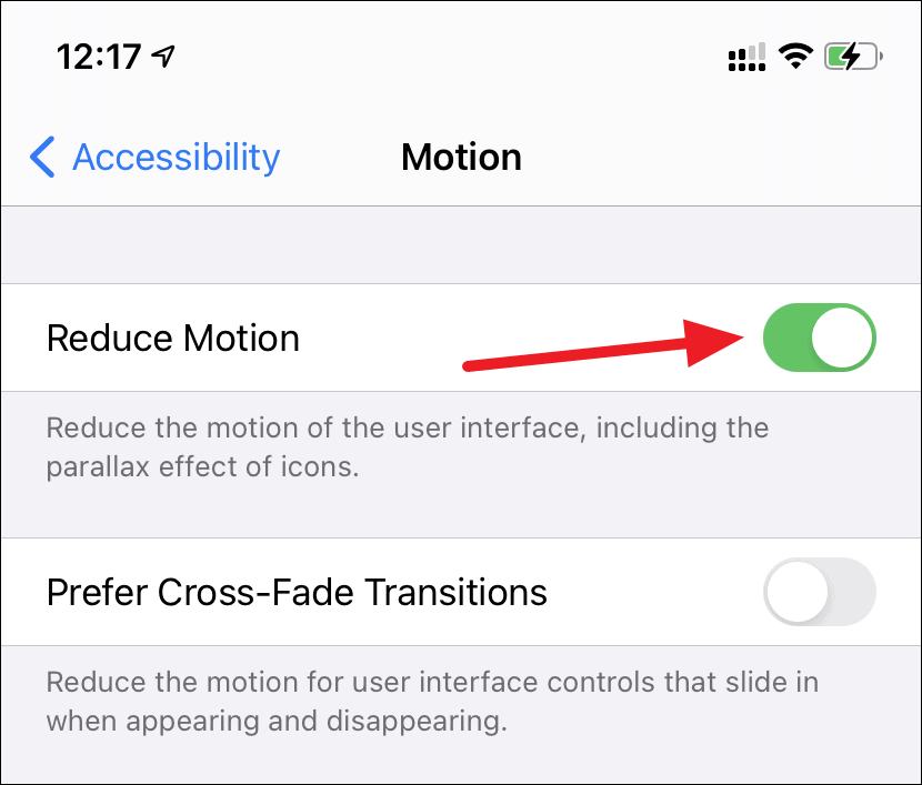 Turn on the toggle switch for ‘Reduce Motion’ option.