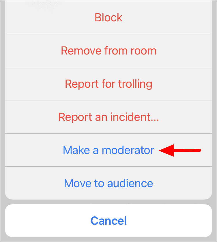 Once you tap on the option, the person will become the moderator. Moreover, you can only make someone a moderator who is on the stage (one who is a speaker).