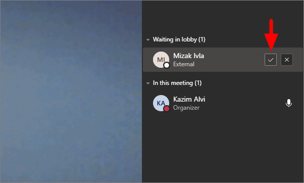 Once you have sent the invite link to someone, wait for them to accept it and join the meeting. As soon as the invitee clicks on join, you will receive a notification for the same. Click on the ‘tick’ mark next to the user’s name to allow them to join.