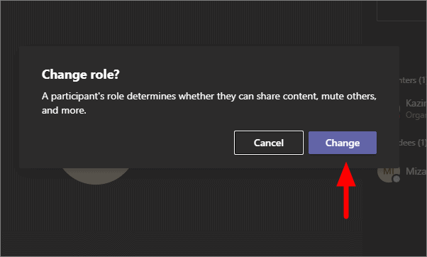 The app will ask for a confirmation on whether you want to change the role from attendee to the presenter. Click on ‘Change’ that is written on a blue background. Making someone a presenter gives them a lot of options in the meeting.