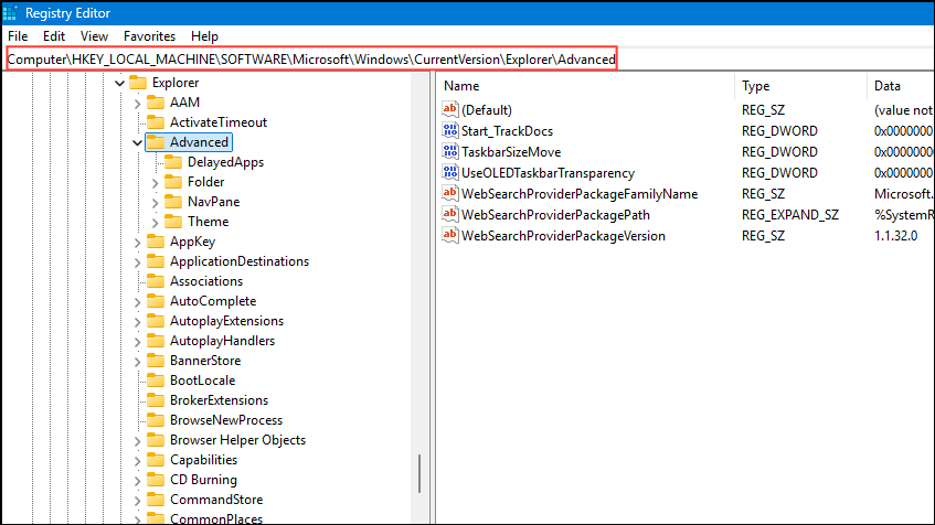 HKEY_LOCAL_MACHINE\Software\Microsoft\Windows\CurrentVersion\Explorer\Advanced