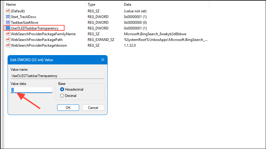 Step 4: Double-click the newly created UseOLEDTaskbarTransparency value and set its value data to 1. Click OK.