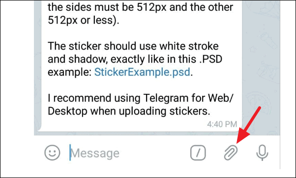 Once I send a name for the pack, the bot will ask to send the image file in PNG or WEBP format with a transparent layer and that image must fit into a 512×512 square. To add image files, tap on the ‘attach’ icon and choose images from your gallery. It is recommended to use the Desktop Telegram app when uploading the images.