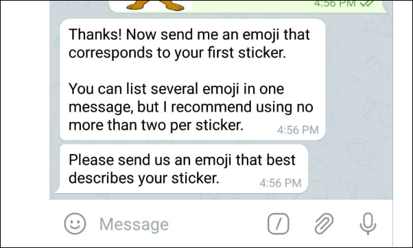 In the next step, the bot will ask you to send an emoji that best represents your sticker, which will be linked to your sticker. You can find detailed emoji meanings on sites like What Emoji and Emojipedia.