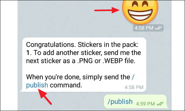 After you send the emoji, you must publish the sticker pack before you can start using it. Tap the ‘/publish’ command to publish the sticker.