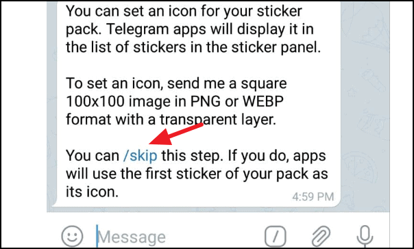 Now, you will be asked to send a 100×100 size image to set it as an icon for your sticker pack. You can choose to add it or tap the ‘/skip’ and the bot will set the first sticker of the pack as its icon.