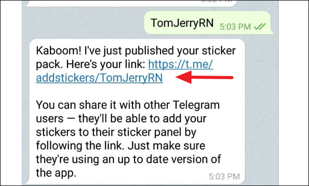 For example, we gave the name ‘TomJerryRN’ to the pack. Then, you will get a message with a link saying that the pack has been published. You can then use that link to add the sticker pack to your account and share it with anyone you want.