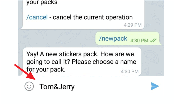 Now tap on ‘/newpack’ to create a new pack and it will ask you for a name for the pack. You should choose a name for your stickers packs. This name will be visible to anyone who sees your stickers. For example, we are giving the name ‘Tom&Jerry’ to the pack.