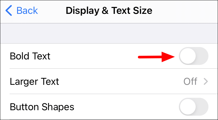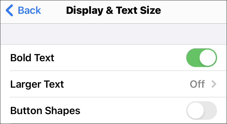 The first setting on this screen is to bolden the text. Boldening the text does not considerably increase the text size, but it certainly enhances visibility and clarity for those with a certain degree of visual impairment. To enable ‘Bold Text’, tap on the toggle right next to it.