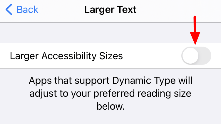 Initially, you will find the same slider as was available in the ‘Text Size’ settings that we discussed earlier. In this setting, you can have more levels of text size to choose from once you tap on the toggle right next to ‘Larger Accessibility Sizes’.