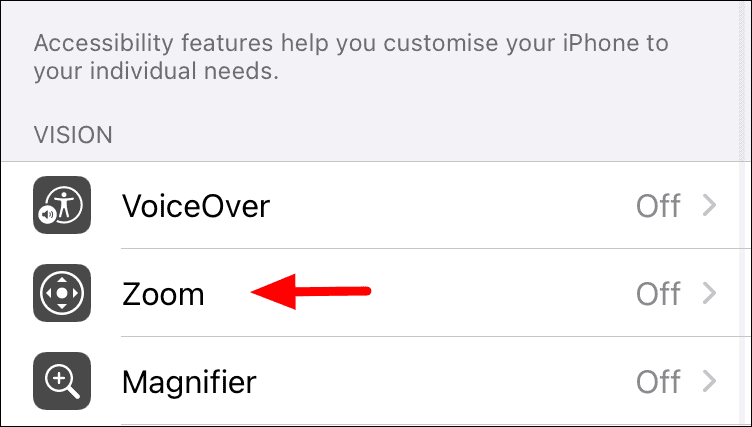 Next, tap on ‘Zoom’ in the list of features under ‘Vision’.
