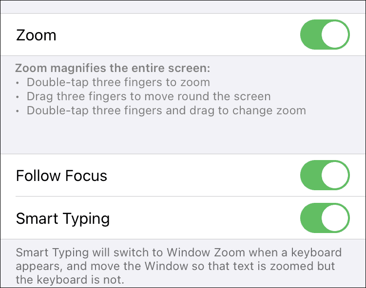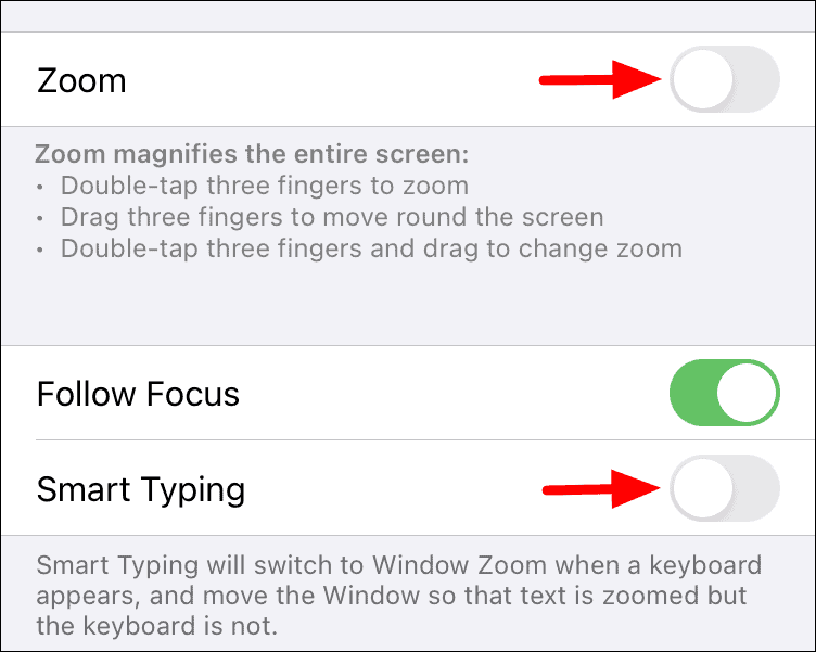 Once you enable both ‘Zoom’ and ‘Smart Typing’, the color of toggles will change from grey to green.