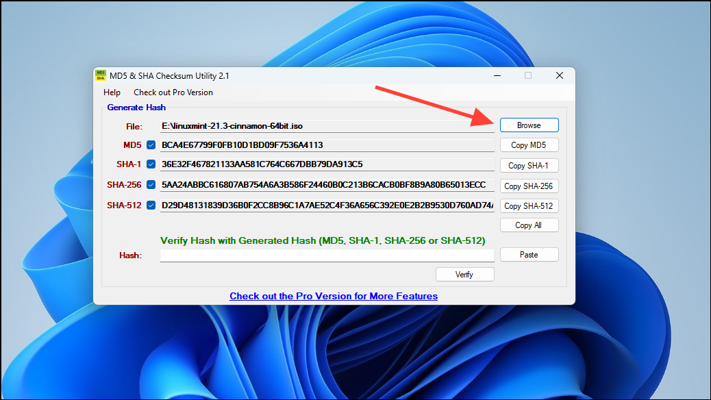 Step 5: Click the 'Browse' button, navigate to the downloaded ISO file, and select it. The application will automatically generate the SHA-1, SHA-256, and SHA-512 hashes.