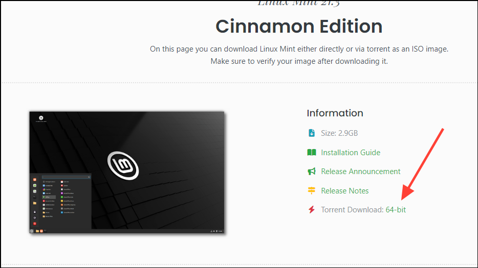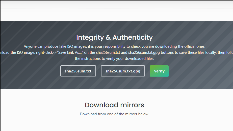 Step 1: To verify the Linux Mint ISO, scroll down the download page until you find the 'Integrity and Authenticity' section.