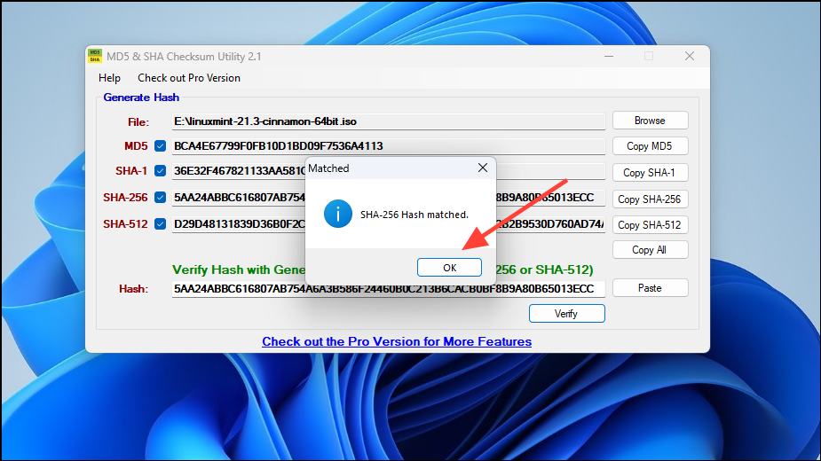 Step 8: If the hash matches, a message will confirm the match, indicating your ISO is authentic and error-free. Click 'OK' and close the application.
