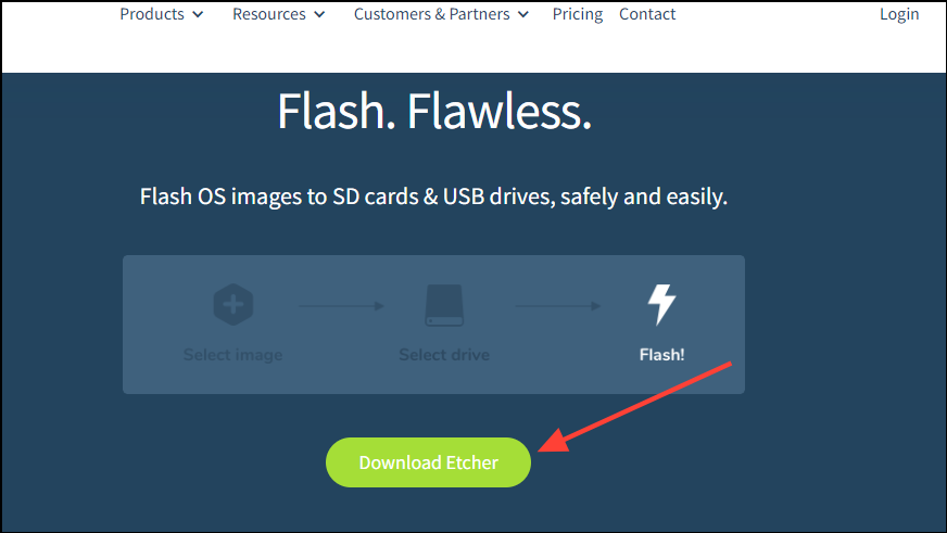 Step 1: Navigate to etcher.balena.io and click the 'Download Etcher' button to get the software.
