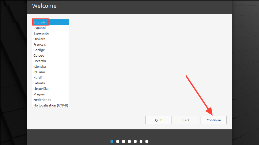 Step 1: Choose your preferred language for the installation by selecting it and clicking the 'Continue' button.