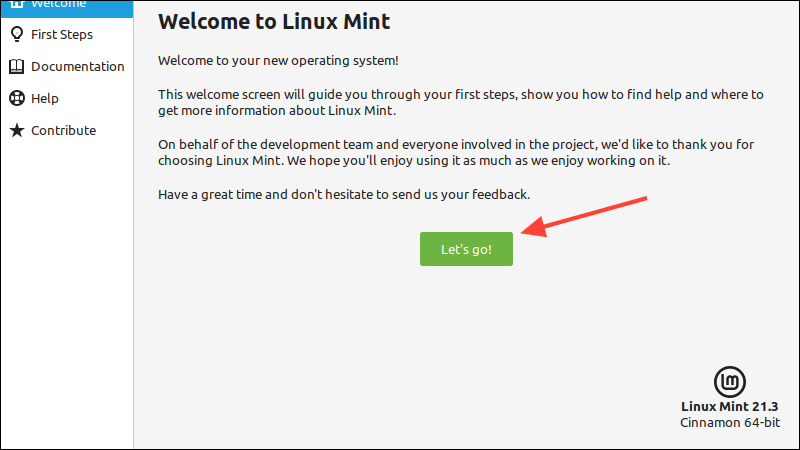 Step 12: You'll be greeted by the Mint Welcome Screen. Click 'Let's Go' to start customizing your desktop, installing apps, and using Linux Mint.