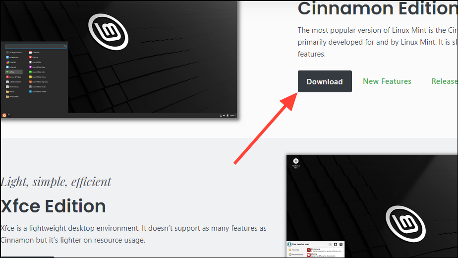 Step 4: On the following page, choose your preferred desktop environment. Linux Mint offers Cinnamon, Xfce, Mate, and Cinnamon Edge. Click on the download button corresponding to the desktop environment you want.