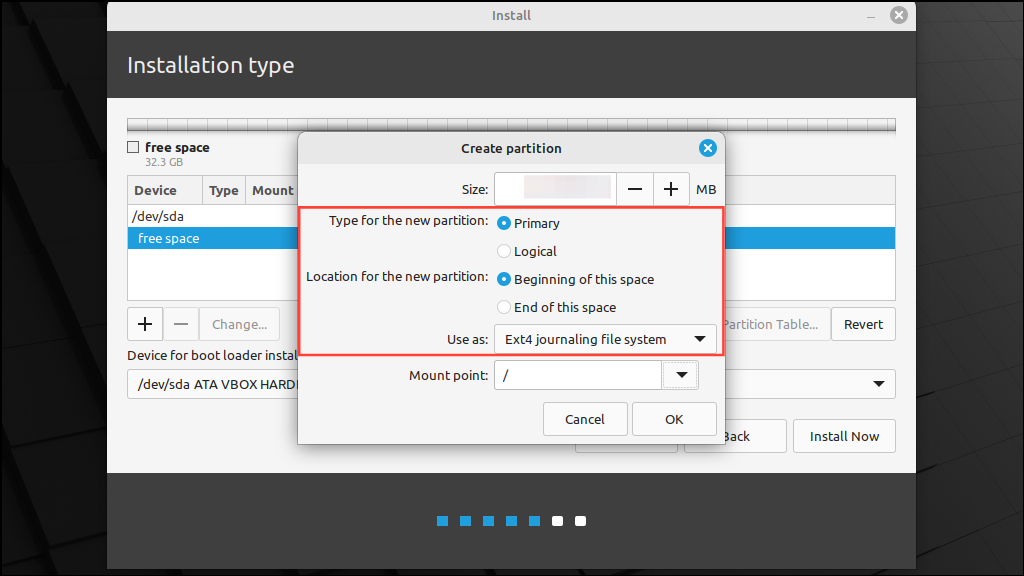 Step 6: Keep the partition type as 'Primary' and the location as 'Beginning of this space'. The file system type should be 'Ext4 journaling file system'.