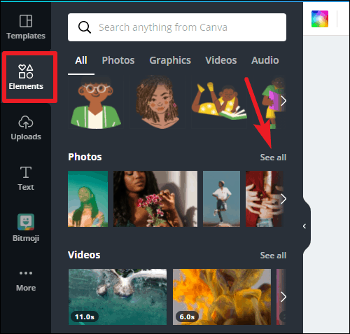 To use a photo from Canva, go to ‘Elements’ and click on ‘See all’ next to Photos. Then, click the photo you want to use.