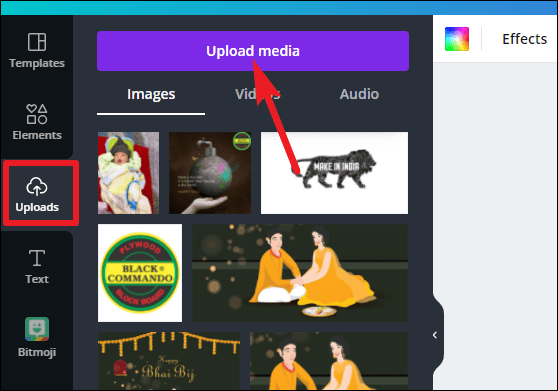 To use your own pic, go to ‘Uploads’. It’ll show all the previous photos you uploaded too. To upload a new photo, click ‘Upload media’. Then, click the photo to add it to the design.