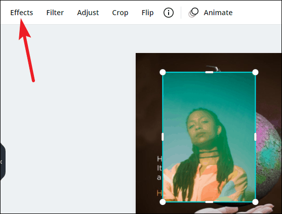 Once you’ve added the photo to your design, go to the design page and click on the image. The element will be selected, and editing options specific to the element will appear above the page. Click on ‘Effects’ from these options.