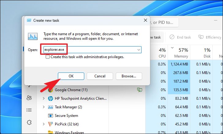 Step 3: Type explorer.exe into the text box and press Enter or click OK.