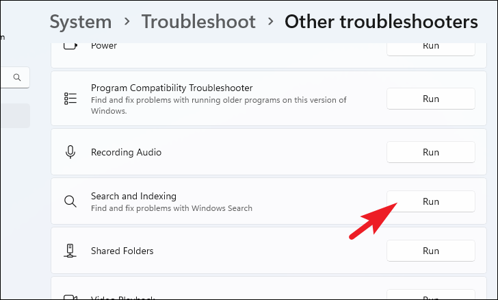 Step 5: Locate the Search and Indexing troubleshooter and click Run.