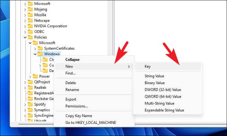 Step 3: Right-click on the Windows folder, hover over New, and select Key. Name the new key Explorer.