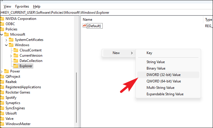 Step 4: Right-click on the Explorer key you just created, hover over New, and select DWORD (32-bit) Value. Name this new DWORD DisableSearchBoxSuggestions.