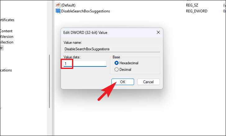 Step 5: Double-click on DisableSearchBoxSuggestions and set the value data to 1. Click OK to save the changes.