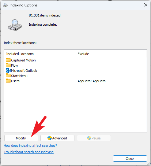 Modify Indexing Options