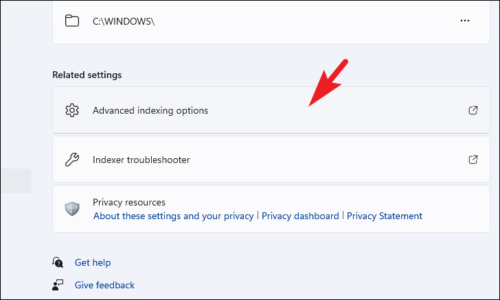 Step 4: Scroll down and select Advanced indexing options to open the Indexing Options window.