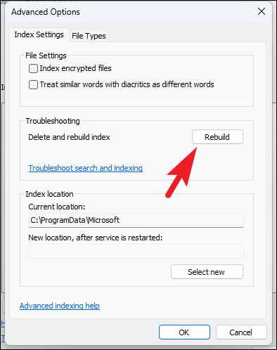 Step 6: Under the Index Settings tab, click on Rebuild in the Troubleshooting section. Confirm by clicking OK.