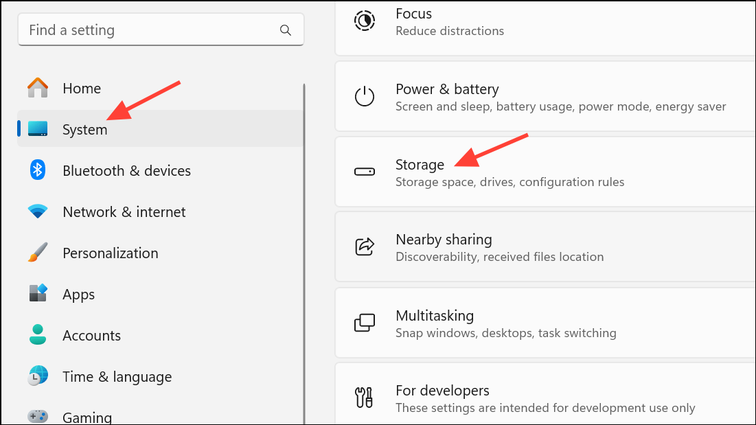 Step 2: Click on System, then select Storage from the left-hand menu. This section manages how and where your files are stored.