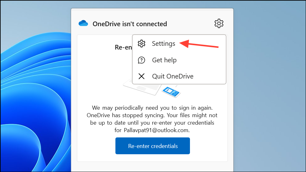 Step 1: Click the OneDrive icon in your system tray, then click the gear icon and select Settings.