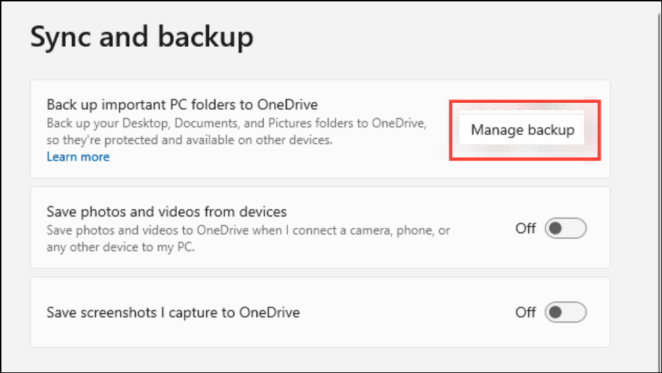 Step 3: Go to the Sync and Backup tab, then click Manage Backup. In the dialog, deselect folders you no longer want to sync with OneDrive, such as Desktop, Documents, and Pictures.