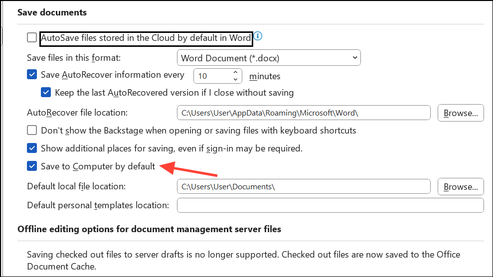 Step 4: Check the box labeled Save to Computer by default. Uncheck AutoSave OneDrive and SharePoint Online files by default if visible. Set your preferred local folder as the Default local file location.