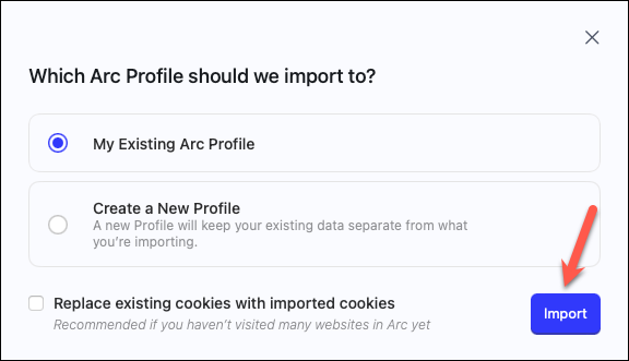 - Then, select which profile you want to import the data to and click the 'Import' button. You can import it to your existing Arc profile or create a new one (this will create a new Space in Arc).