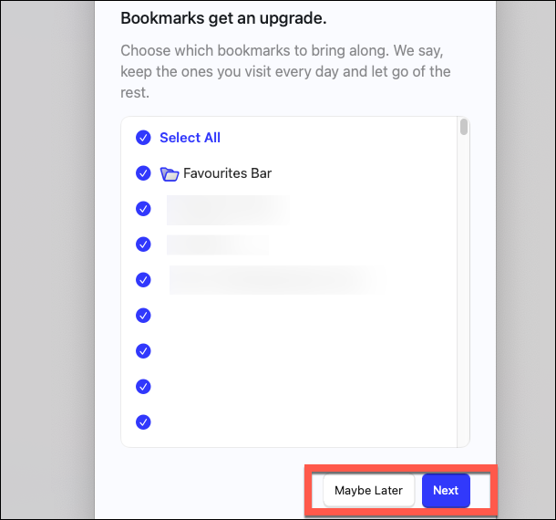 - Then, select which bookmarks you want to import; you can 'Select All', select individually, or skip the step altogether. Click 'Next' to proceed.