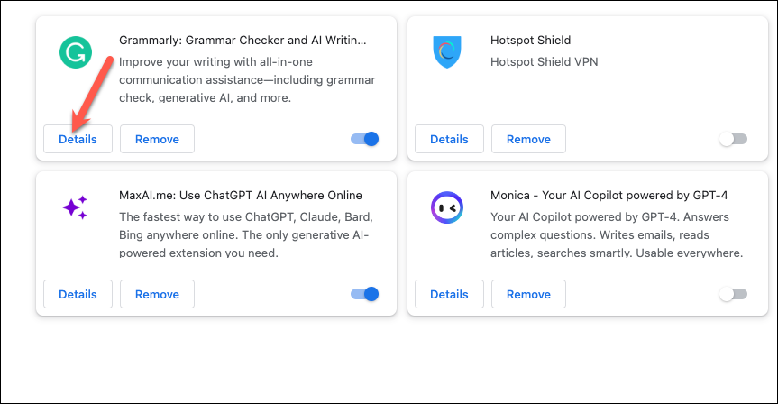 - You can also enable an extension for incognito mode from here. Click on the 'Details' button for the extension you want to allow in incognito browsing.