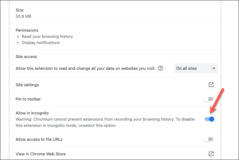 - Then, turn on the toggle for 'Allow in incognito'.