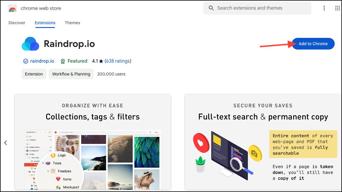- Go to the Chrome web store and search for 'Raindrop.io'. You can also click this link to open the extension.