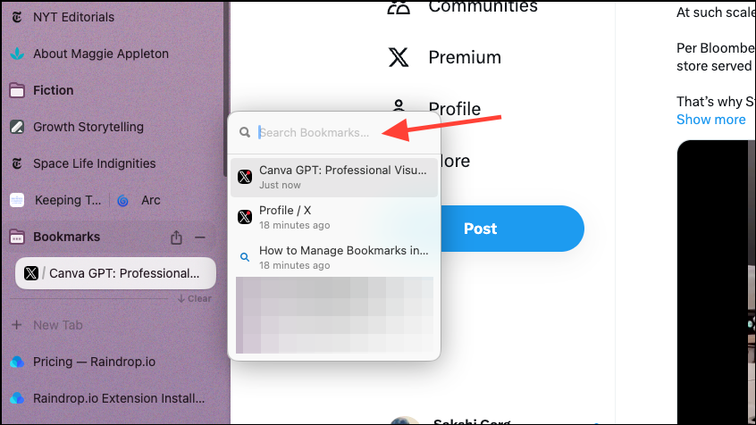 - The one downside, though, is that you cannot add new bookmarks to this list from Arc automatically. You'll need to manually add a new bookmark by clicking the 'Organize' button (three-dot menu) in the top-right corner.