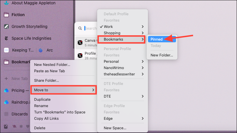 You can also use a Chrome extension, like Raindrop, to manage your bookmarks. When using an extension like Raindrop, you get the additional benefit of having your bookmarks available on any browser/ device. (Importing your pinned tabs from Arc to another browser will be a headache since you'll need to manually do it).