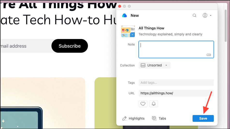- Raindrop clipper window will open. Tweak the settings according to your preference (change the screenshot, name, add a description, choose the collection, mark it as a favorite, etc.) and click the 'Save' button.