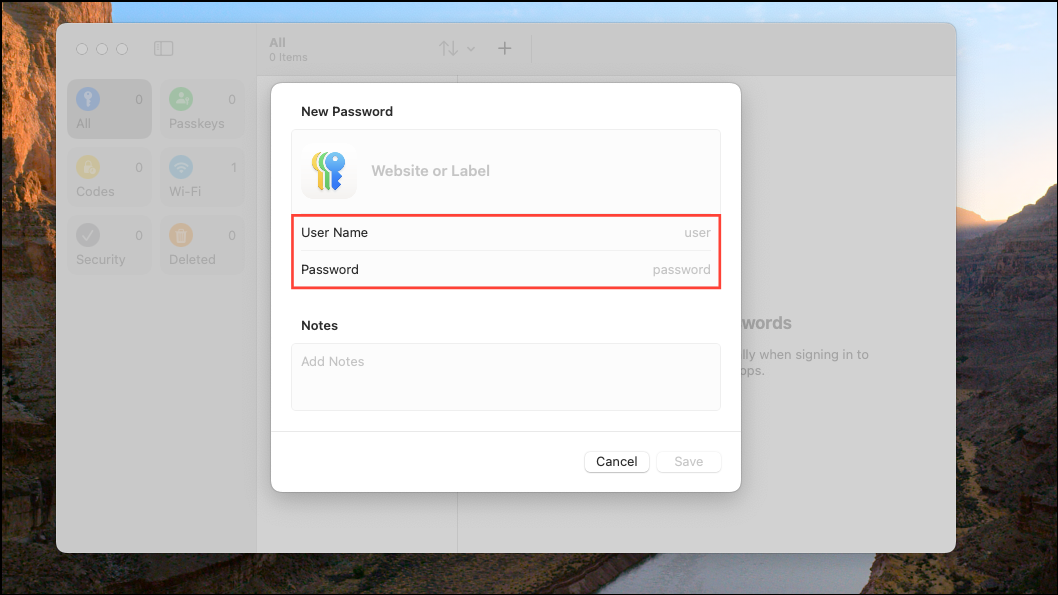 Step 1: To manually add a new password, open the Passwords app and select File > New Password or use the shortcut Command + N. You can also click the "+" button at the top. Then enter the website URL, username, and password in the provided fields, then click "Save."